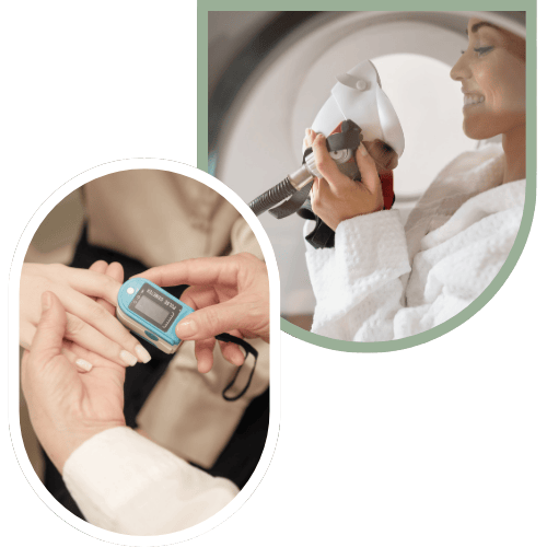 Inside the hyperbaric chamber, you breathe 100% oxygen at increased atmospheric pressure. This allows oxygen to dissolve directly into your plasma – bypassing the limitations of hemoglobin alone – so your blood can deliver oxygen more efficiently to tissues throughout your body.